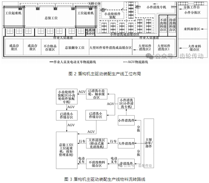 盾構機主驅動的裝配需求分析是裝配生產線設計的基礎。常規土壓平衡盾構機主驅動結構主要包括主軸承、變速箱、主驅動環件、密封件、減速機、小齒輪和變頻電機等部件。主軸承是主驅動的核心部件,同時承受軸向、徑向及傾覆力矩;變速箱及主驅動環件是主驅動主體構成部分;小齒輪與主軸承大齒圈組成齒輪副以傳遞扭矩。