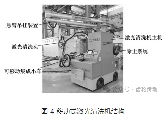 大件清洗階段所用移動式激光清洗機結構如圖 4 所示。圖 4 的結構主要由激光清洗機主機、激光清洗頭、除塵系統、懸臂吊掛裝置和可移動集成小車等部件組成。通過應用表面力學共振、污物熱膨脹和瞬間氣化原理的清洗技術,將窄脈寬、高功率密度的激光束照射于工件表面,使工件表面的油污、銹蝕和氣割氧化物等發生瞬間蒸發或剝離,高速有效地清除鋼材件表面有害雜質。作為一種非接觸式清洗方法,激光清洗具有綠色環保、精準可控和無基材損傷等優勢。此外,通過配置移動式集成小車,使激光清洗機能靈活調整清洗位置,使用方便,占地面積小,清洗效率高。
