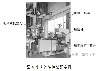 小齒輪組件經過清洗后轉運至小齒輪組件裝配專機工位進行自動加熱及壓裝。小齒輪組件裝配專機如圖 6 所示,主要由桁架式機器人、軸承加熱器、精準定位工作臺和壓裝機協同開展工作,可實現對軸承及小齒輪的自動上下料、軸承自動加熱保溫、軸承與小齒輪裝配面精準定位、軸承自動壓裝及生產信息展示功能,滿足主驅動小齒輪組件自動化裝配。通過合理安排各設備工作效率,可保證單套小齒輪組件產出節拍為 20 分/ 套。