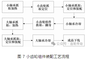 在小齒輪組件裝配專機接收到小齒輪組件裝配指令,同時物料通過 AGV 轉運至上料工作位后,自動開始識別檢測、裝配等工作。小齒輪組件裝配工藝流程如圖 7 所示。