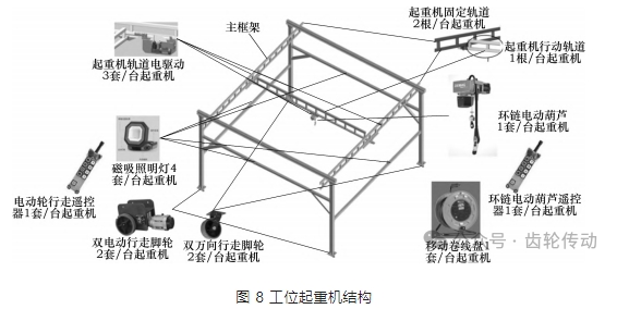 在完成小齒輪組件裝配后,將物料轉運至總裝工位完成主驅動其余零/ 部件裝配,此階段起重吊裝主要由工位起重機結合行車完成。工位起重機結構如圖 8 所示,由主框架、行走軌道(起重機行動軌道)、電動葫蘆、萬向行走腳輪、電動行走腳輪、照明系統和控制系統組成。為滿足主驅動總裝裝配對作業空間的要求,設計工位起重機主框架外形尺寸為 9.50m × 9.32m,有效起吊區域為8.1m×7.1m;為滿足主驅動大部分小型零/ 部件的起重量及裝配速度需求,在主框架上設計額定負載各為2t 的2根固定軌道和1根行動軌道;采用雙電動行走腳輪加雙萬向行走腳輪結構,配置工業級耐磨腳輪和腳杯,保證工位起重機具備優良的調速和靜動特性;為保證使用安全,配備了安全保護、過載過熱保護、漏電保護及起升限位開關等保護設施。