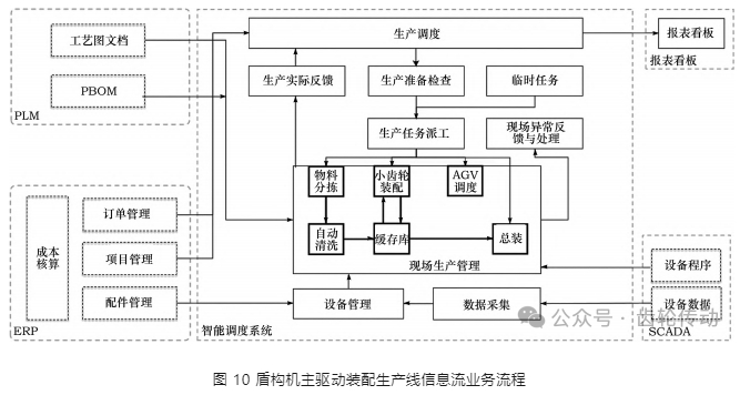 近年來,生產制造系統逐步朝著信息化、智能化發展,以便處理海量復雜的生產裝配質量信息,進一步提高生產系統的柔性化和自動化水平。為了提高主驅動裝配過程信息化管理程度,該裝配生產線通 過研發并設計智能調度系統,實現主驅動裝配生產線生產計劃與上游 PLM、ERP 等系統的信息銜接,協同 SCADA 系統完成設備信息及裝配過程的數據采集與監控,各設備之間的信息交互及裝配過程聯動信息可通過報表看板展示。盾構機主驅動裝配生產線信息流業務流程見圖 10。