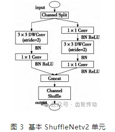 如圖 3 所示,本文使用先進的 ShuffleNetv2 單元,其中 Channel Split 操作將通道數平均分成兩部分,代替了原有的分組卷積結構。每個分支中的卷積層輸入、輸出通道數均相同,其中一個分支不進行任何操作以減少基本單元數。針對 ShuffleNetv2 中單元塊的下采樣,不再采用 Channel Split,通過在每個分支中添加stride = 2 代替原有的 Channel Split 模塊以提高模型容量及檢測效率。最后使用 Concat、Channle Shuffle 代替原有的 Add、Re-LU 模塊以增加模型通道之間的信息交流。綜合上述改動,特征圖空間大小將減半,且使模型具有較高的模型容量和檢測效率,減小了模型的計算復雜度,降低了模型的內存占用率,極大地提高了模型的計算效率。