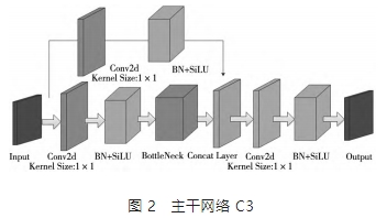 YOLOv5s 中主干網絡 C3,如圖 2 所示,旨在更好地提取圖像的深層特征。C3 主要由 Bottleneck、Conv2d、BN + SiLU 激活函數組成,輸入通道分為兩個分支,通過兩個分支的卷積運算,將特征映射中的通道數減半。然后特征映射通過第二分支中的 Conv2d 層、BN 層和瓶頸層,并利用 Concat 層對兩個分支進行深度融合。最后,通過連續穿過 Conv2d 層和 BN 層生成模塊的輸出特征映射,特征映射的大小與主干網絡 C3 的輸入大小相同。