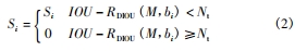 式中: Si 表示第 i 個檢測框對應的置信度得分,RDIOU ( M,bi ) 表示基于 DIOU 的檢測框交叉比,M 表示置信度得分最高的檢測框,bi 表示剩余檢測框集合中的第 i 個檢測框,Nt 表示設定的閾值。本文 DIOU 損失函數的懲罰項可以定義為: