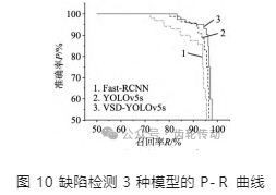 本文將3 種模型在測試過程中產生的準確率以及召回率記錄并繪制 P-R 曲線圖,如圖 10 所示,通過 P-R 曲線我們可以看到 VSD-YOLOv5s 模型的性能優于 Fast-RCNN 和 YOLOv5s。