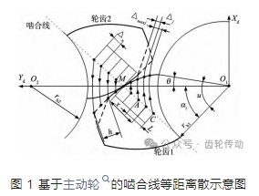 建立坐標系 XdOYd,如圖 1 所示,以 Δx 作為增量等距離散嚙合線,并在圓周方向上計算出輪齒 1 上的齒廓對應點,若該點位于修形齒廓區域內,嚙合線離散點的齒廓對應點處的修形量 Δj 為: