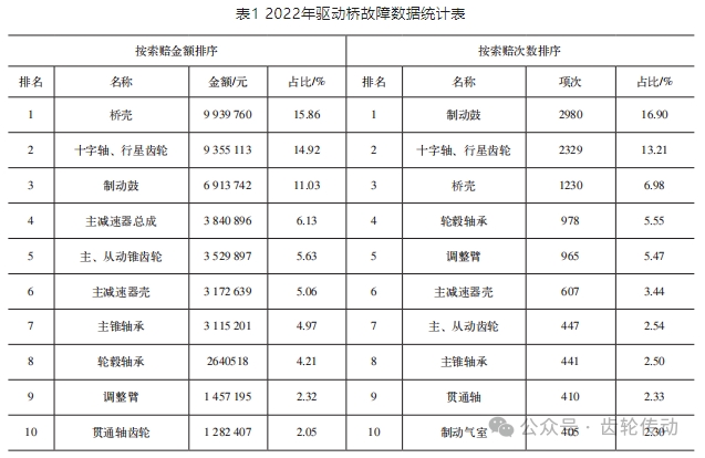 差速器失效的主要原因是載荷大、轉速高,路況惡劣及潤滑不良等,目前隨著差速器殼體及墊片的改進升級,差速器當前主要失效模式是十字軸磨損燒蝕。在統計某年全年驅動橋故障數據時發現,十字軸與行星齒輪故障無論按索賠金額還是索賠次數都排在第二位置,見表1。