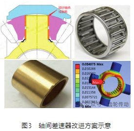 在現有產品上改進兩種方案均,需要減小十字軸直徑或加大行星齒輪內孔直徑。通過有限元計算臨時按十字軸直徑減小2.5mm來進行試制樣件,為便于快速測試效果,采用了市場現有的帶保持架的滾針軸承(見圖3)。