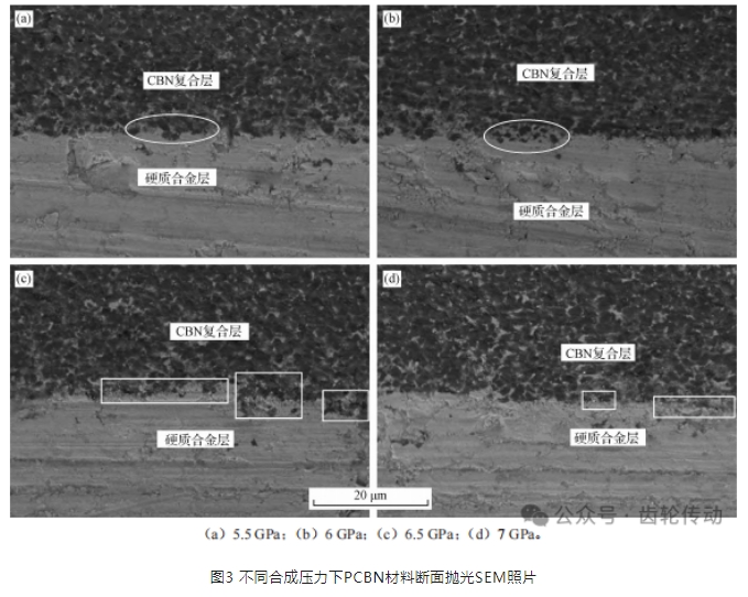 圖 3為不同合成壓力下 PCBN材料斷面拋光后的SEM照片。