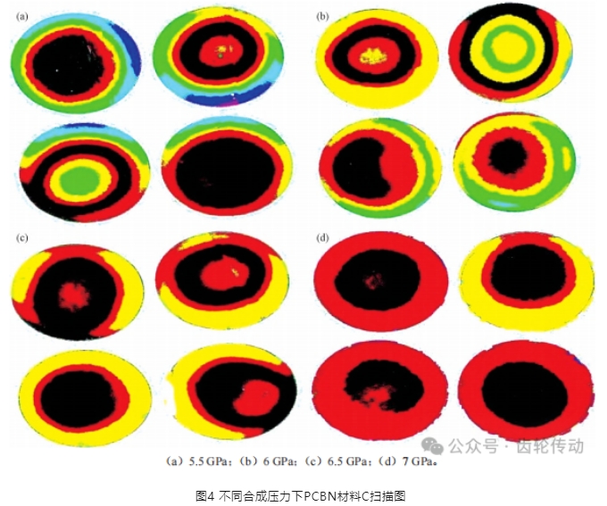 由圖4可知,隨著壓力的增加,樣品中的顏色偏差越來越少,厚度分布逐漸變得均勻,平整度越變越好。這可能是在較高的合成壓力下整個高壓腔體內部趨于等壓狀態,從四周到中心的壓力梯度減小所致。這表明,提高合成壓力有助于提高 PCBN 材料中CBN層的平整度。