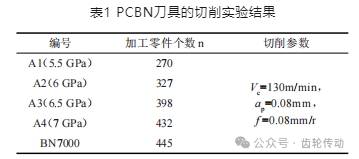 實驗選取國際一線品牌日本住友電工的 BN700 作對比,將實驗合成的 PCBN 材料制成 TNGA160408外圓車刀進行車削實驗。工件材料為 20CrMnTi齒輪件,工件硬度為58~62 HRC。以在相同的加工參數下加工的零件個數作為刀具切削性能的考量標準。不同刀具的切削實驗結果如表 1 所示,其中 A1、A2、A3、A4 分別表示 5.5、6.0、6.5、7 GPa 下合成的刀具材料,BN7000 表示日本住友電工的刀具材料。在 5.5 GPa 下合成的 A1 材料,由于合成壓力較低,因此其力學性能較差,做成的 A1 刀具的耐磨性也較差,加工零件個數最少,僅有 270個;隨著合成壓力的提升,刀具加工的零件個數在增加。在合成壓力為 6.5 GPa時,合成出的 A3樣品有較好的耐磨損性能,此時的刀具加工零件個數較多,達到了398個。當合成壓力為7 GPa時,A4刀具加工零件個數最多,達到 432 個。刀具材料的切削性能與其力學性能相關,力學性能優異的材料其相應的刀具切削性能也優異。BN7000刀具加工齒輪件個數最多,達到 445個,實驗在 7 GPa下合成的刀具材料性能與住友 BN700 在加工齒輪件上性能比較接近,有很好的市場前景。