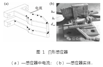 本文以一風(fēng)電機(jī)組齒輪箱齒圈為仿真對象,齒輪模數(shù) m = 16,齒數(shù) z = 95,齒寬 b = 200 mm.所用感應(yīng)器為Π形感應(yīng)器,圖 1 為Π形感應(yīng)器電流走向和實(shí)體結(jié)構(gòu),其中 hπ = 10 mm,dmπ = 20 mm,hπ0 = 40 mm.冷卻采用在感應(yīng)器端部增加噴淋孔的方式,根據(jù)感應(yīng)器的實(shí)體結(jié)構(gòu)可以得到該熱處理過程的掃描速度為 3. 8 mm/s.掃描感應(yīng)淬火的電參數(shù)均為用示波器測量感應(yīng)線圈接線柱得到的,相關(guān)參數(shù)如表 1 所示.所用電源為 IGBT 晶體管變頻電源,額定輸出功率為 250 kW.