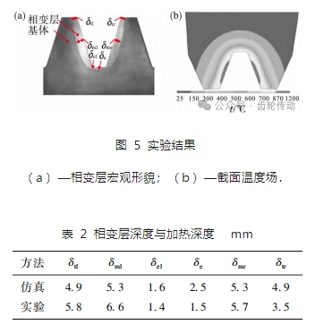 對試件打磨拋光后,使用 4% 硝酸酒精溶液腐蝕表面,獲得如圖 5a 所示相變層形貌.對修正后模型的計算結(jié)果,截取相同位置的溫度場,獲取圖 5b 所示云圖.結(jié)果顯示,側(cè)向齒廓位置相變層深度顯著大于齒根及圓角處.齒輪材料 42CrMo 的相變起始溫度為 718 ℃,以此為判據(jù)測量仿真云圖中的加熱層深度.齒廓方向不同位置的加熱層深度及相變層深度如表 2 所示.