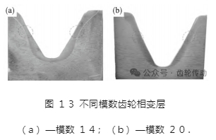 圖 13 為不同模數(shù)的齒輪逐齒感應(yīng)淬火后的相變層形貌. 圖 13a 中齒輪模數(shù)為 14,圖 13b 齒輪模數(shù)為 20.兩齒輪側(cè)向齒廓靠近齒頂中上的位置,均如圖 12 中存在相似的相變層深度減小現(xiàn)象,圖 13a 中的減小現(xiàn)象相較于圖 13b 中的減小現(xiàn)象更為明顯.同時隨著模數(shù)增大,齒根及齒根圓角位置的相變層深度發(fā)生明顯的降低.