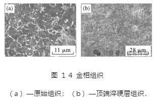 圖 14 為實(shí)驗(yàn)齒輪的金相組織照片.圖 14a 顯示 42CrMo 的原始組織為片狀珠光體和鐵素體組織.圖 14b 為經(jīng)感應(yīng)淬硬后的金相組織,經(jīng)感應(yīng)淬火后形成板條狀馬氏體組織.