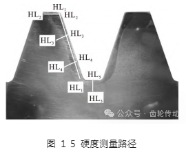 硬度是判斷齒輪淬火強(qiáng)化結(jié)果的一項(xiàng)重要指標(biāo),在硬化層內(nèi)應(yīng)獲得相對均勻的硬度分布.測量硬度的硬度計為 TMHV - 30Z 維氏硬度計,硬度計通過接口與計算機(jī)連接,測量得到的數(shù)據(jù)可以 直接在計算機(jī)上轉(zhuǎn)換成洛氏硬度并讀取.為研究齒廓及深度方向的淬硬效果,建立圖 15 所示的 5 條分析路徑進(jìn)行顯微硬度測定.其中路徑 HL1 - HL1 與齒廓平行,距離為 0. 5 mm. 路徑HL2 - HL2 與齒頂邊界平行,距離為 1. 35 mm.路徑 HL3 - HL3、HL4 - HL4 為與側(cè)向齒廓垂直向內(nèi)的路徑,與齒頂距離分別為14. 5 mm 和29 mm.HL5 - HL5 為與齒根中心位置垂直向內(nèi)的路徑.