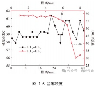 圖 16 為側(cè)向齒廓 HL1 - HL1 路徑與齒頂 HL2 - HL2 路徑的硬度分布.齒廓 HL1 - HL1 路徑硬度幾乎全部達(dá)到 58HRC 以上,符合硬度要求,并且硬度數(shù)值變化相對較小. HL2-HL2 路徑上,硬度在距離齒廓 5 mm 以內(nèi)相對穩(wěn)定,維持在較高數(shù)值.齒頂淬硬深度約為 6. 5 mm,小于相變層深度(7. 45 mm).