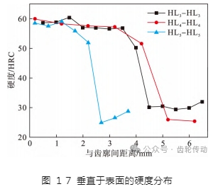 垂直于齒輪齒面的 HL3 - HL3 至 HL5 - HL5 路徑上的硬度分布如圖 17 所示.在 HL3 - HL3 路徑上,硬化層內(nèi)硬度較為穩(wěn)定,在交界處硬度有顯著降低.在 HL4 - HL4 路徑上的硬度從齒廓向內(nèi)較均勻地降低,同樣在齒根位置 HL5 - HL5 路徑上的硬度分布有相同的趨勢.