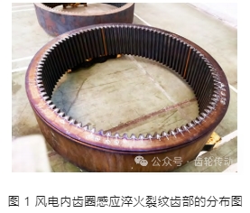 內齒圈材料為 42CrMo4 鋼,模數 21 mm,齒輪外徑 Φ2166 mm,內徑 Φ1832 mm,齒寬 550 mm,單齒感應淬火工藝,節圓層深要求 4.4 ~ 5.4 mm。內齒圈感應淬火后,在磁粉探傷時,發現齒頂處存在感應淬火裂紋。內齒圈感應淬火裂紋齒部的分布圖如圖 1 所示。由圖 1 可見,內齒圈表面呈藍色回火色,圖 1 中箭頭所指的齒部均存在感應淬火裂紋。由圖 1 所見,裂紋分布處較多,幾乎達到了整個齒輪 3 /4 的齒數。