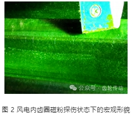 圖 2 為風電內齒圈磁粉探傷狀態下的宏觀形貌。可見,磁粉聚集線位于齒頂附近,沿徑向分布。