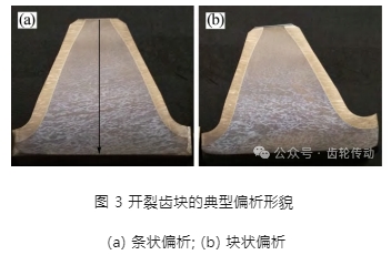 為進一步分析聚集線形成原因,對內齒圈進行了金相分析。使用線切割在裂紋附近選取齒塊截面試樣進行低倍形貌觀察。共取 10 根開裂齒條進行解剖分析,分析了感應淬火裂紋齒塊的低倍組織特征,得到了感應淬火裂紋齒塊的兩種典型的宏觀低倍形貌(見圖 3) 。由圖 3 可知,在感應淬火開裂的齒部呈現較為嚴重的組織偏析,如箭頭位置所示,偏析組織呈現塊狀和條帶狀。