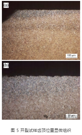 由于裂紋位置均發生在齒頂處,因此對齒頂附近進行金相檢查,圖 5 是齒頂附近截面顯微組織,發現齒頂附近存在深約 60 μm 的脫碳層,脫碳層組織為塊狀鐵素體 + 馬氏體,次表面層組織為馬氏體,根據 JB /T 9204—2008《鋼件感應淬火金相檢驗》可以評定其馬氏體級別為 4 級,未見組織粗大特征。