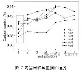 在齒圈均布取 6 個感應淬火開裂齒塊,進行化學成分測試,以對整個齒圈進行碳偏析分析。內齒圈碳含量偏析程度如圖 7 所示。由圖 7 可知,整個齒圈鍛件的碳偏析程度已經達到了 0.06% 的偏差。即使在 1 號位置(齒頂處) 碳偏析程度也達到了0.04%左右。