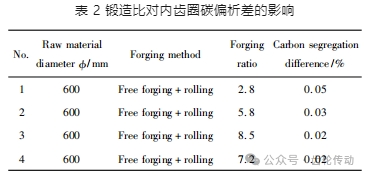 自由鍛是風電內齒圈的常用成形方法,合理的鍛造比可以保證坯料的均勻性和致密程度。表 2 為鍛造比對內齒圈碳偏析差的影響。由表 2 可知,連鑄坯鍛造比達到 7 以上時,內齒圈碳偏析差可降低至 0.02%。