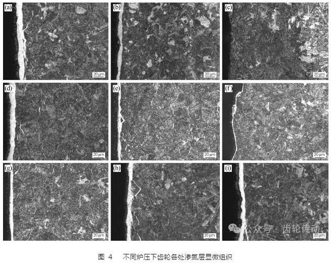 圖 4(g~i)為爐壓為 330 Pa 時,輪齒各處的滲氮層顯微組織。可以看到,在齒頂處的白亮層和 230 Pa 和 280 Pa 時相比,稍有減薄,約為 7 μm,在節圓和齒根處白亮層厚度和 230 Pa 和 280 Pa 時相比,明顯增加,約為 8 μm。齒頂、節圓、齒根處的化合物層中疏松級別皆為 1 級;在齒頂和節圓處脈狀氮化物約為 2 級,且在齒根處也出現了微量的脈狀氮化物。
