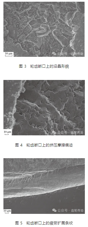在輪齒剝落位置取樣,使用 EVO-18 型掃描電子顯微鏡觀察剝落位置的斷口形貌。剝落位置沿晶斷口形貌,如圖 3 所示;剝落斷口上開裂較早的位置因受擠壓的作用形成摩擦痕跡,如圖 4 所示;同時也發現受齒輪循環載荷影響形成的疲勞擴展條紋,如圖 5 所示。分析認為,該輪齒區域的剝落層是在行星輪運轉過程中產生的,在斷口上未發現明顯的冶金缺陷。