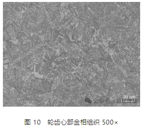 輪齒心部組織為低碳馬氏體+貝氏體,晶粒度為 7 級,未發現不良組織,如圖 10 所示。