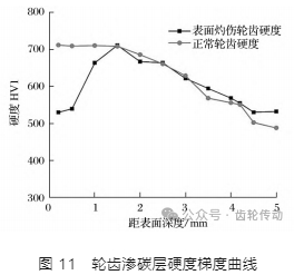 在齒面靠近齒根的剝落區域和正常區域,使用 HVS-1000A 型維氏硬度計檢測其硬度梯度,其硬度梯度曲線如圖 11 所示。結果顯示:該行星輪齒面有效硬化層深度為 4.2 mm,符合圖紙技術要求;靠近齒根的剝落區域齒面表層約 1.0 mm 范圍內較正常齒面 硬度明顯降低。