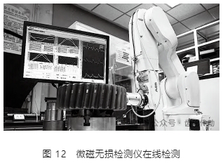 鑒于齒輪磨削燒傷問題對齒輪正常服役和壽命的嚴重影響,需要對燒傷齒輪予以及時地甄別和篩選。文獻介紹了多種檢測齒輪磨削燒傷的檢測方法,其中磁彈法可以在工業生產中無損、快速、簡單、便捷地檢測齒輪磨削燒傷。磁彈法檢測磨削燒傷的原理是,鐵磁性材料的顯微組織和殘余應力發生改變會影響材料的巴克豪森噪聲。需要注意的是,在生產實踐中使用磁彈法檢測磨削燒傷時,首先需要針對所檢測的產品材料,制作一組標準試樣,并在試驗出最佳磁化電壓后,確定磨削燒傷臨界值作為判定依據。目前,國內團隊針對微磁技術做了大量研究,研制了微磁無損檢測儀,實現對滲碳齒輪齒面在線磨削燒傷檢測,如圖 12 所示。
