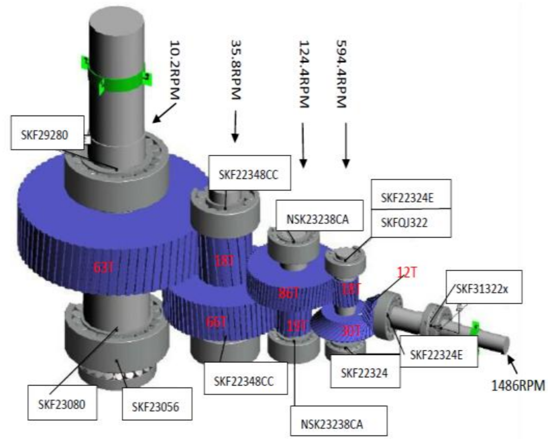 低速重載齒輪箱通常齒輪級(jí)數(shù)多、軸承多,運(yùn)行過程中可能會(huì)產(chǎn)生各級(jí)齒輪嚙合頻率、各軸承故障特征頻率、各轉(zhuǎn)軸的轉(zhuǎn)動(dòng)頻率等等,頻率成分較復(fù)雜,而在這些頻率中,高速軸齒輪缺陷嚙合產(chǎn)生的沖擊能量通常較大,產(chǎn)生的幅值較大的振動(dòng);而低速軸軸承、齒輪缺陷產(chǎn)生的沖擊能量往往較小,產(chǎn)生幅值較小的振動(dòng),這就往往容易被忽視而造成漏判。