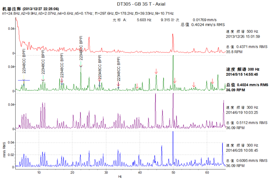 2014 年 5 月 15 日進(jìn)行第二次振動(dòng)檢測,檢測發(fā)現(xiàn),齒輪箱的狀態(tài)與上次檢測時(shí)相比發(fā)生了明顯的變化,經(jīng)分析,得到的結(jié)論是齒輪箱 GB 2S 軸上部軸承和 GB 3S 軸上部軸承出現(xiàn)了明顯故障,軸承內(nèi)圈出現(xiàn)嚴(yán)重磨損現(xiàn)象,需計(jì)劃安排更換軸承。