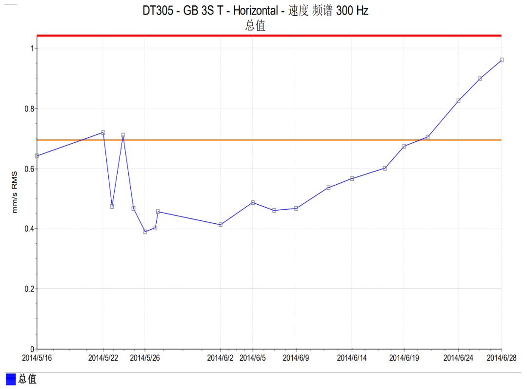 由于生產(chǎn)不允許停機(jī),對齒輪箱進(jìn)行監(jiān)控運(yùn)行,通過振動(dòng)趨勢的監(jiān)測發(fā)現(xiàn),GB 2S T 和 GB 3S T 軸承測點(diǎn)振動(dòng)值在不斷抬升(見圖 5 和圖 6),說明軸承狀態(tài)在不斷惡化,在做好檢修的充分準(zhǔn)備工作后于 2014 年 6 月 28 日按計(jì)劃停機(jī)檢修。