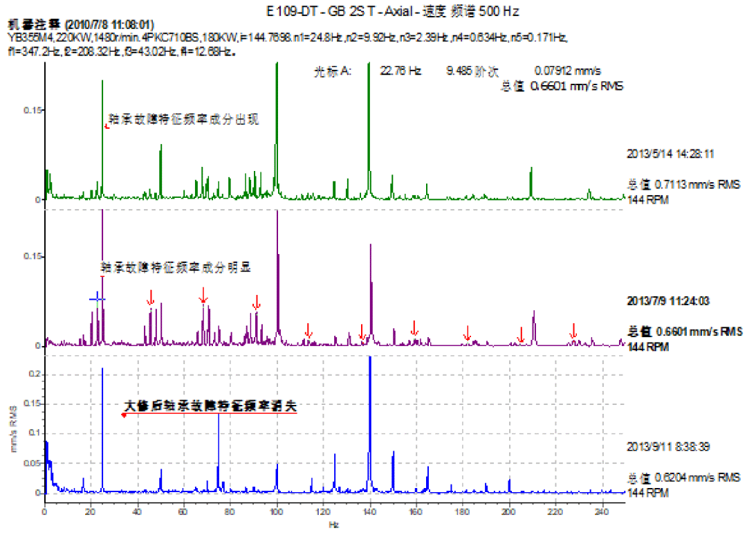 當(dāng)故障發(fā)展到速度頻譜中出現(xiàn)了軸承故障特征頻率并伴隨有邊頻帶,即使是振動(dòng)幅值很小,換句話說就是建議必須盡快計(jì)劃更換軸承了,上述的兩個(gè)案例就是很好的說明。通過上面的實(shí)例,我們還發(fā)現(xiàn)在軸承內(nèi)圈故障特征頻率兩邊出現(xiàn)轉(zhuǎn)軸轉(zhuǎn)頻的邊頻帶,則是此類低速重載軸承損壞時(shí)一個(gè)比較明顯的特征。低速重載滾動(dòng)軸承一旦出現(xiàn)故障,故障發(fā)展得較快,這就需要我們制定合適的檢測周期,特別是發(fā)現(xiàn)故障后。