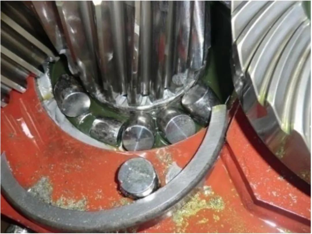 下面介紹另一大豆壓榨廠的脫溶機(jī)(DT)減速機(jī)軸承故障案例,2013年7月份我們檢測時(shí)發(fā)現(xiàn)了 GB-2S 軸軸承(SKF22328CC)出現(xiàn)了內(nèi)圈故障特征頻率成分,并伴隨 GB 2S 軸轉(zhuǎn)頻的邊頻帶(見圖 9),建議停機(jī)檢查,但由于一直沒有采取行動(dòng),也沒有采取任何加強(qiáng)監(jiān)測的手段,到 9 月份由于軸承嚴(yán)重?fù)p壞導(dǎo)致齒輪嚴(yán)重?fù)p傷的二次破壞停車事故(見圖 10),對生產(chǎn)造成了嚴(yán)重的影響,對檢修工作非常被動(dòng),造成了不小的經(jīng)濟(jì)損失。