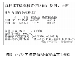 抽取正向和反向拉花鍵的產品各30件,測量內花鍵M值進行雙樣本T分析。H0:正向與反向拉花鍵對M 值沒有顯著差異;H1:正向與反向拉花鍵對M值有顯著差異。分析結果如圖3所示,P值<0.05,拒絕H0,正向和反向拉花鍵的一擋內花鍵M值存在明顯差異。因此,確定熱前改用反向拉花鍵的工藝。