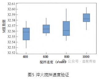 (2)攪拌速度 理論上降低淬火烈度,有利于淬火變形的改善。通過改變淬火攪拌速度,降低淬火油的流量,驗證內花鍵的熱變形變化。不同攪拌速度的驗證結果如圖5所示,從四種攪拌速度統計數據看,600r/min淬火的M值數據均值靠近中差,且標準差最小,數據更優,配合拉刀的調整可以實現熱后M值合格。