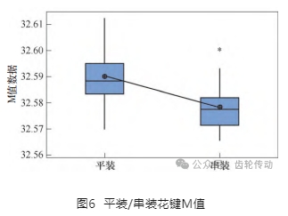 通常而言,串裝吊立方式會因為零件自重帶來蠕變,內孔圓度變差,內花鍵錐度和周累變大。而平放能使零件徑向冷卻均勻,周累和錐度變形較小。然而該零件的結構特殊,齒輪大而輪輻薄,且內孔上下結構不一致,平放時的變形程度更加嚴重。因此結合該零件內孔有凸臺,并非對稱結構,做平裝并增加補償套的方式,對比用補償芯軸串裝吊立的方式來驗證能否減少內花鍵變形。驗證結果如圖6所示,熱處理平裝和串裝的一擋內花鍵M值存在明顯差異,且串裝的均值和標準差好于平裝。