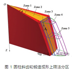成形載荷可以用來確定模具材料、設備噸位等參數, 是齒輪塑性成形重要的力能參數。國內外學者針對圓柱齒輪精鍛成形工藝特點, 基于簡化漸開線齒輪形狀, 采用上限法、滑移線法及主應力法等塑性力學解析方法建立齒輪塑性成形載荷預測方法。圖 1 所示為圓柱螺旋/ 斜齒輪閉式鍛造中使用上限法對塑性變形區進行分區求解其成形載荷。雖然通過解析法從理論上可以預測齒輪精密塑性成形載荷, 但由于齒輪塑性成形過程復雜, 理論計算過程復雜, 工業應用不便。