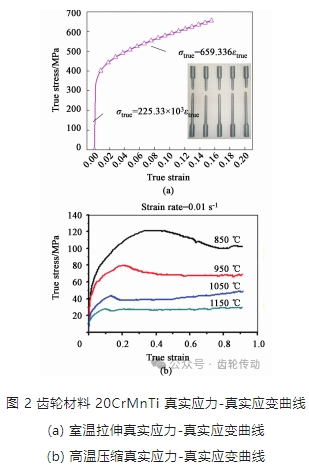 利用單向室溫拉伸實驗和高溫熱壓縮實驗得到材料真實應力-真實應變曲線, 然后通過擬合方法得到齒輪本構方程, 圖 2 所示分別為齒輪鋼 20CrMnTi 利用 Zwick Z100 電子萬能材料試驗機和 Gleeble-3500 熱壓縮模擬機得到的室溫和高溫真實應力-真實應變曲線。從圖 2a 可知, 20CrMnTi齒輪材料在室溫下真實應力隨真實應變的增大而增大; 從圖 2b 可知, 20CrMnTi 齒輪材料在應變速 率為 0. 01 s -1 時, 其高溫變形真實應力隨著真實應變的增大先增大到峰值然后減小隨后趨于穩定, 且溫度越高, 其真實應力越小。