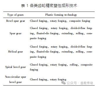 圓錐直齒輪、圓柱直齒輪、圓柱螺旋/ 斜齒輪、圓錐螺旋齒輪和非圓錐直齒輪等不同的齒輪類型齒形特點不同, 采用的精密塑性成形技術不同, 具體如表 1 所示。