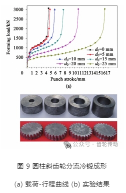 齒輪閉式冷精鍛成形是坯料在室溫下在密閉模具型腔中發生塑性變形并充滿型腔。齒輪閉式冷精鍛成形技術一般分為制坯和成形兩工步, 工藝流程短, 成形精度高, 且金屬流線沿齒廓連續分布, 齒輪力學性能好。但是齒輪閉式冷精鍛成形工藝變形抗力大, 需要的設備噸位大, 而且齒形填充效果差。國內外許多學者針對圓錐直齒輪、圓柱直齒輪和圓柱螺旋/ 斜齒輪冷鍛成形工藝中齒形填充過程、模具失效形式以及成形缺陷等方面進行了大量探索研究。齒輪浮動凹模鍛造技術是將凹模設計成浮動運動的一種閉式冷精鍛工藝, 通過在凹模下面設置彈性元件, 在成形過程中凸模、凹模和坯料一起運動, 將凹模和坯料之間產生的摩擦力轉變為促進坯料充填型腔的積極摩擦力來減小金屬流動的摩擦阻力, 從而有效降低成形載荷和提高齒形填充效果。依據浮動凹模原理, 可以通過調控凸模和凹模之間的相對速度來調整凹模和坯料之間的摩擦力的大小和方向, 進而調控金屬流動過程、成形載荷、齒形填充效果以及成形缺陷等。為了降低齒輪閉式冷精鍛成形載荷, 改善齒形充填效果, 一些學者采用分流鍛造技術成形圓柱直齒輪、圓柱斜齒輪。CHOI J C 等提出了內腔分流成形圓柱直齒輪的方法來提高齒形的填充效果。寇淑清等和 WANG G C 等分別提出了閉式鐓擠-約束孔分流兩步成形 法、閉式模鍛-向內分流法和預鍛分流區-分流終鍛工藝成形直齒圓柱齒輪, 不但顯著降低了成形力, 而且明顯改善了齒形充填效果。FENG W 等通過設計不同分流孔徑的坯料, 實現了圓柱螺旋/ 斜齒輪冷精鍛成形, 圖 9 為不同分流孔徑下齒輪成形載荷變化曲線以及成形樣件。由于齒輪冷精鍛成形載荷大, 主要用于小模數汽車圓錐直齒輪成形制造。