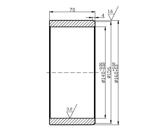 軸套材料建議選擇優先45#鋼或ZG310,45#鋼需調質處理硬度達到HB230-HB250,使其表面達到一定的硬度提高其耐磨性。在沒有45#鋼的情況下也可選擇Q235,或者取一段無縫鋼管加工成需要的尺寸。在加工時需要注意防止工件變形,同時需要考慮工件受熱的膨脹量對鋼套與軸配合公差的影響。查機械設計手冊得碳鋼在20-100℃的線膨脹系數為:α=(10.6~12.2)X10-6,在(20-200)℃的線膨脹系數為:α=(11.3~13)X10-6。假設這里取α=11.3X10-6,溫度差為80℃,則根據公式:D=D(1+αΔT)得出:D=140(1+11.3X10-6X80)=140.126mm。這只是理論計算,實際受材料成分、受熱情況、微觀結構等因數影響,膨脹量可能沒有那么多,建議給內孔公差為-0.01~-0.03mm,因為軸受熱同時也會膨脹。