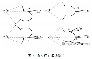 為了進(jìn)一步說(shuō)明檢測(cè)原理,將檢測(cè)過(guò)程拆分。如圖 6 所示,被測(cè)齒輪以角速度 ω 勻速轉(zhuǎn)動(dòng),被測(cè)齒輪與測(cè)頭的相對(duì)位置由 A 變化到 C,測(cè)頭始終指向被測(cè)齒輪中心。