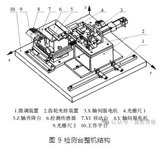 線齒輪加工精度檢測(cè)臺(tái)的結(jié)構(gòu)如圖 9 所示,采用三坐標(biāo)布置形式,結(jié)構(gòu)簡(jiǎn)單,便于操作,主要包括:檢測(cè)傳感器、XY 移動(dòng)臺(tái)、伺服電機(jī)、Z 軸升降臺(tái)、光柵尺、工作平臺(tái)、微調(diào)裝置、齒輪夾持裝置。光柵尺 1 和 光柵尺 2 分別設(shè)置在 XY 方向上,精準(zhǔn)獲取檢測(cè)傳感器的位置,實(shí)時(shí)采集位置信息。底座工作平臺(tái)采用大理石,具有不易變形,硬度高,耐磨性好等優(yōu)點(diǎn)。