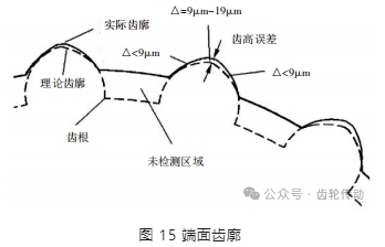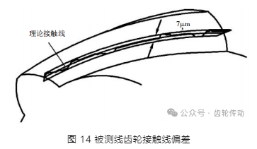 由于檢測(cè)傳感器的局限性,齒根附近區(qū)域無(wú)法檢測(cè),但由于線齒輪傳動(dòng)過(guò)程中該區(qū)域不參與嚙合,可以忽略這部分的檢測(cè)。將檢測(cè)數(shù)據(jù)點(diǎn)通過(guò) MAT- LAB 計(jì)算或者導(dǎo)入 CAD 軟件后使用 CAD 測(cè)量工具進(jìn)行測(cè)量,可得到接觸線所在位置的齒厚誤差為 17 μm。由圖 15 可知,接觸線加工誤差 Δ < 9 μm,齒高加工誤差為 19 μm。